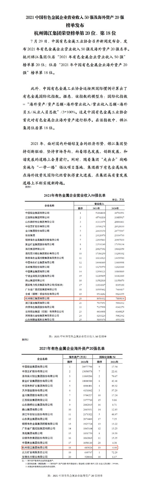 2021中國有色金屬企業(yè)營業(yè)收入50強及海外資產(chǎn)20強 榜單發(fā)布 杭州錦江集團(tuán)榮登榜單第20位、第18位