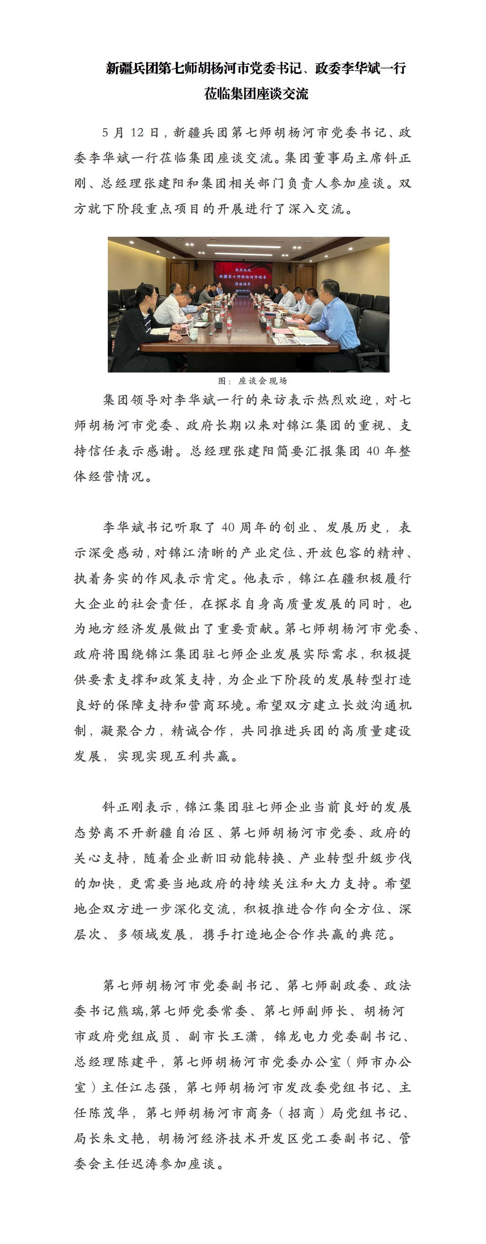 新疆兵團(tuán)第七師胡楊河市黨委書(shū)記、政委李華斌一行 蒞臨集團(tuán)座談交流